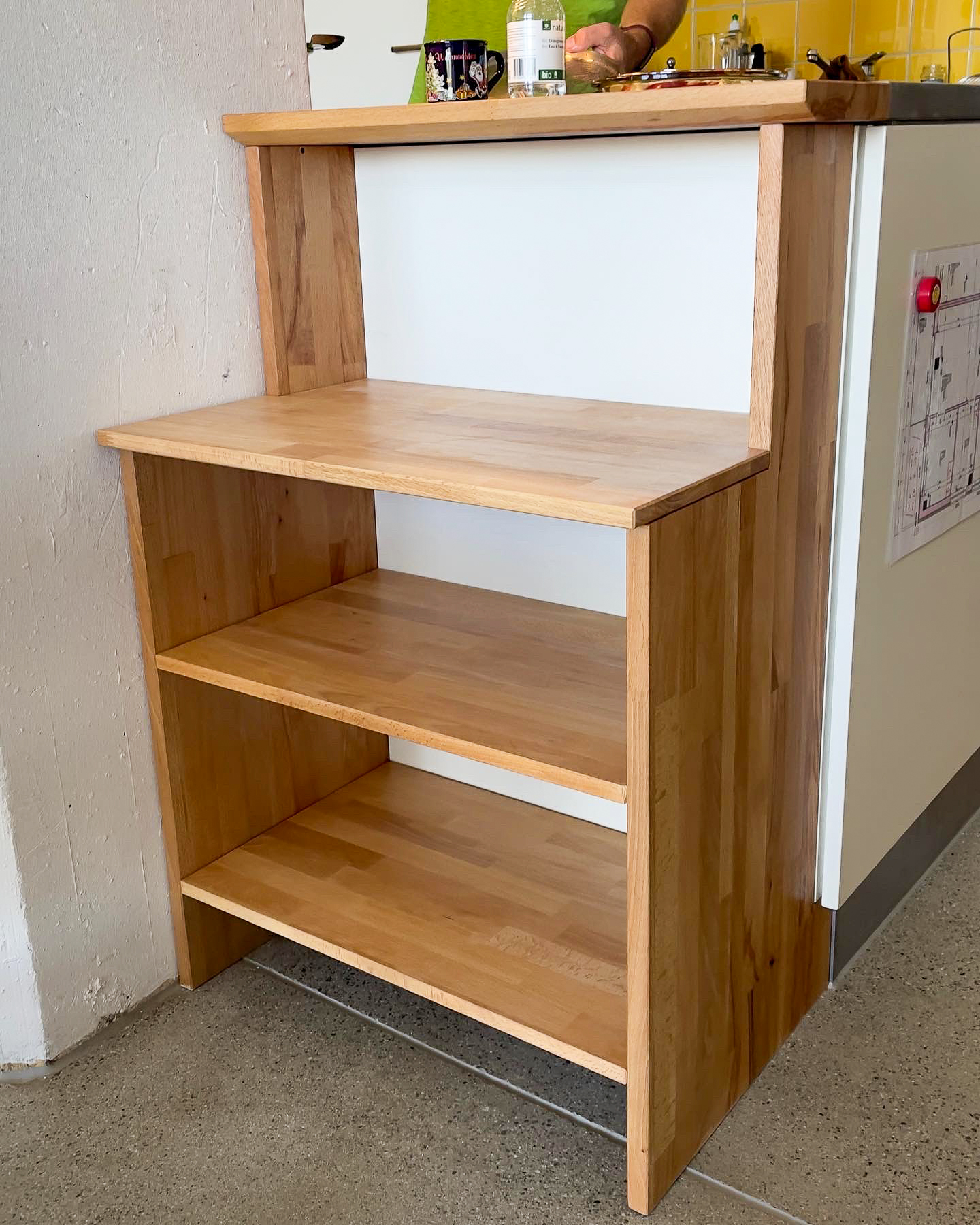 Hinter dem Küchenkorpus bzw. hinter der Arbeitsfläche mit Herd und Backofen steht eine Säule. Links und rechts der Säule sollen ein Regal für Kochbücher und ein Regal für Küchenutensilien gestellt werden.